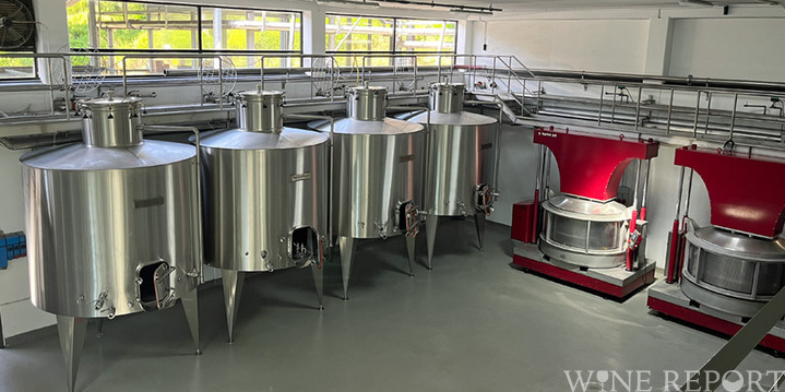 小型の垂直圧搾機とステンレス発酵槽