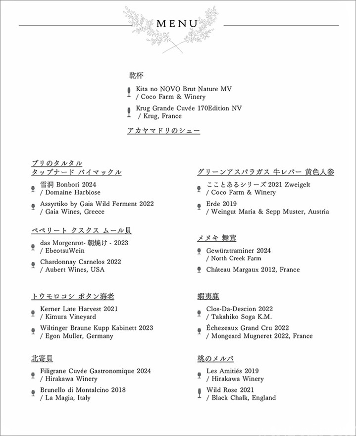 2023年に始めた年末の「50万円ペアリング」と「100万円ペアリング」は好調を続けている。クリュッグの2種のクロ・シャンパーニュや1樽しかないルドメーヌ・フレーヴのモンラッシェなどをグラスで供するイベントは、訪れた顧客から翌年の予約が入るという。2025年12月の料理とワインの月間売り上げは1億円を超えた。昨年1月に来店したルフレーヴ当主ブリス・ド・ラ・モランディエールもその価値を認め、特別にモンラッシェの供出を認めてくれたという。