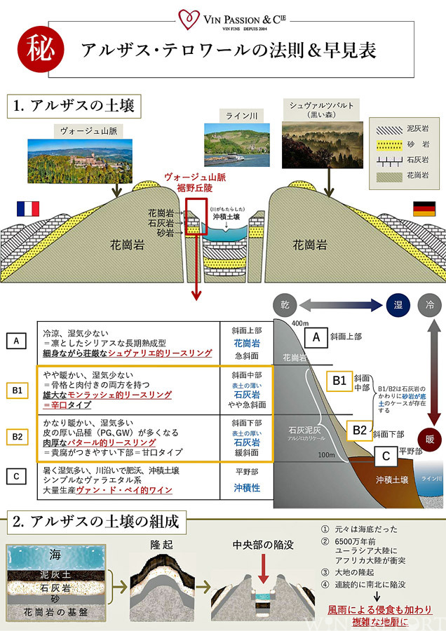 アルザスを飲もうとする時の障害が、多彩な品種、わかりにくい格付け、多彩な土壌の複雑さなどだ。テロワールを理解する簡単な方法を、ボットゲイルを輸入するヴァンパッシオンの川上大介社長が紹介してくれた。手がかりは標高と土壌である。この法則を基にリースリングをとらえてみる。アルザスはひとまずリースリングから入ろう。